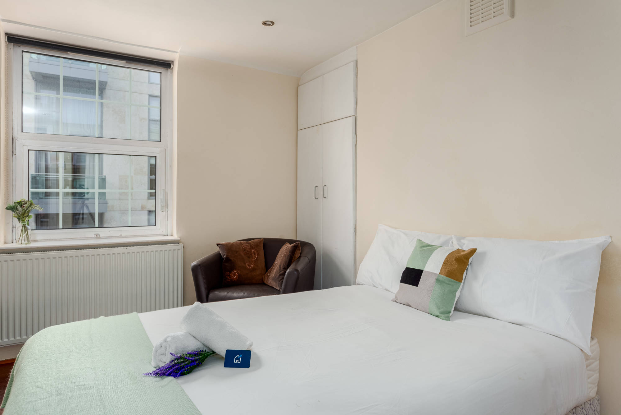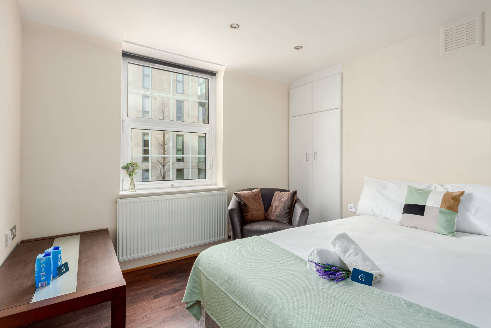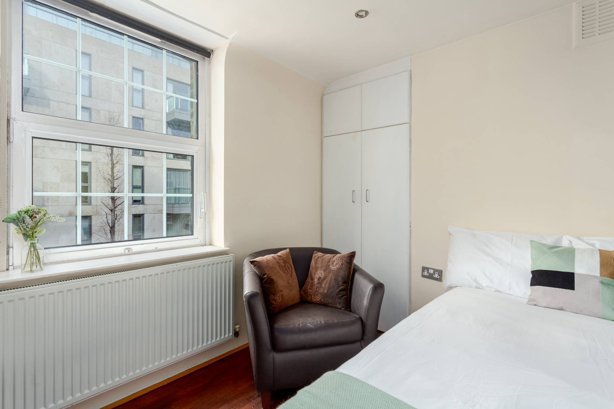 Newly refurbished second floor (with lift) studio apartment to let within purpose built development close to Victoria. The studio is entered into a hallway from which all rooms are accessed. Large studio room with double bed and seating area, separate kitchen with integrated appliances, fully tiled shower room. The property further benefits form wood flooring throughout, full wall of storage and communal courtyard gardens.