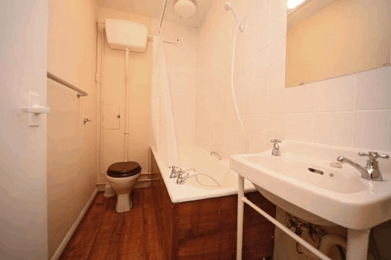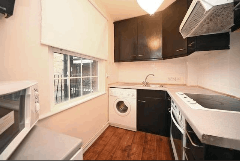 The apartment has a large entrance hall leading to a studio room with wood floors, space for dining, sofa and fitted wardrobes. Separate kitchen with washing machine. Bathroom with power shower over the bath.