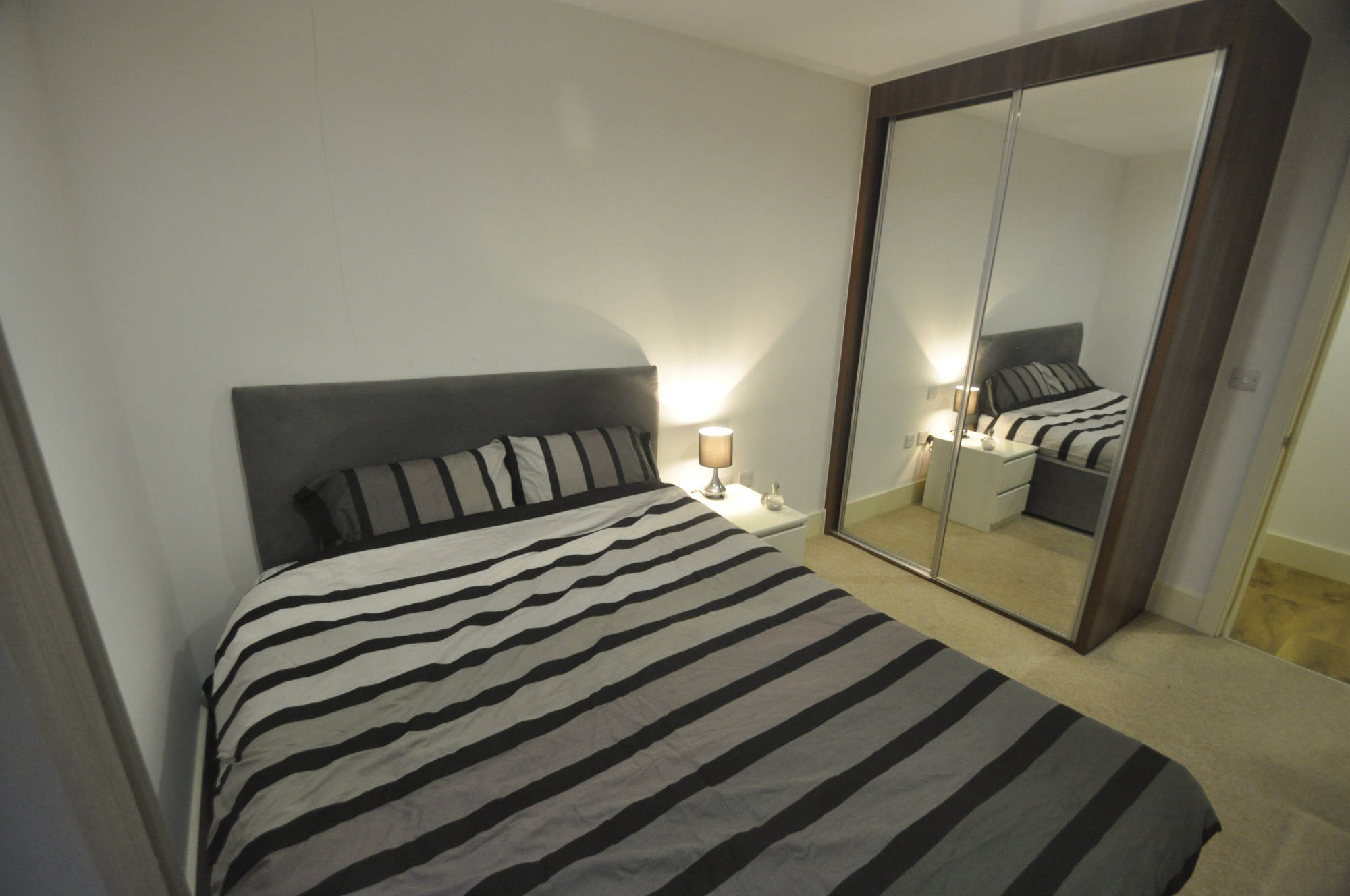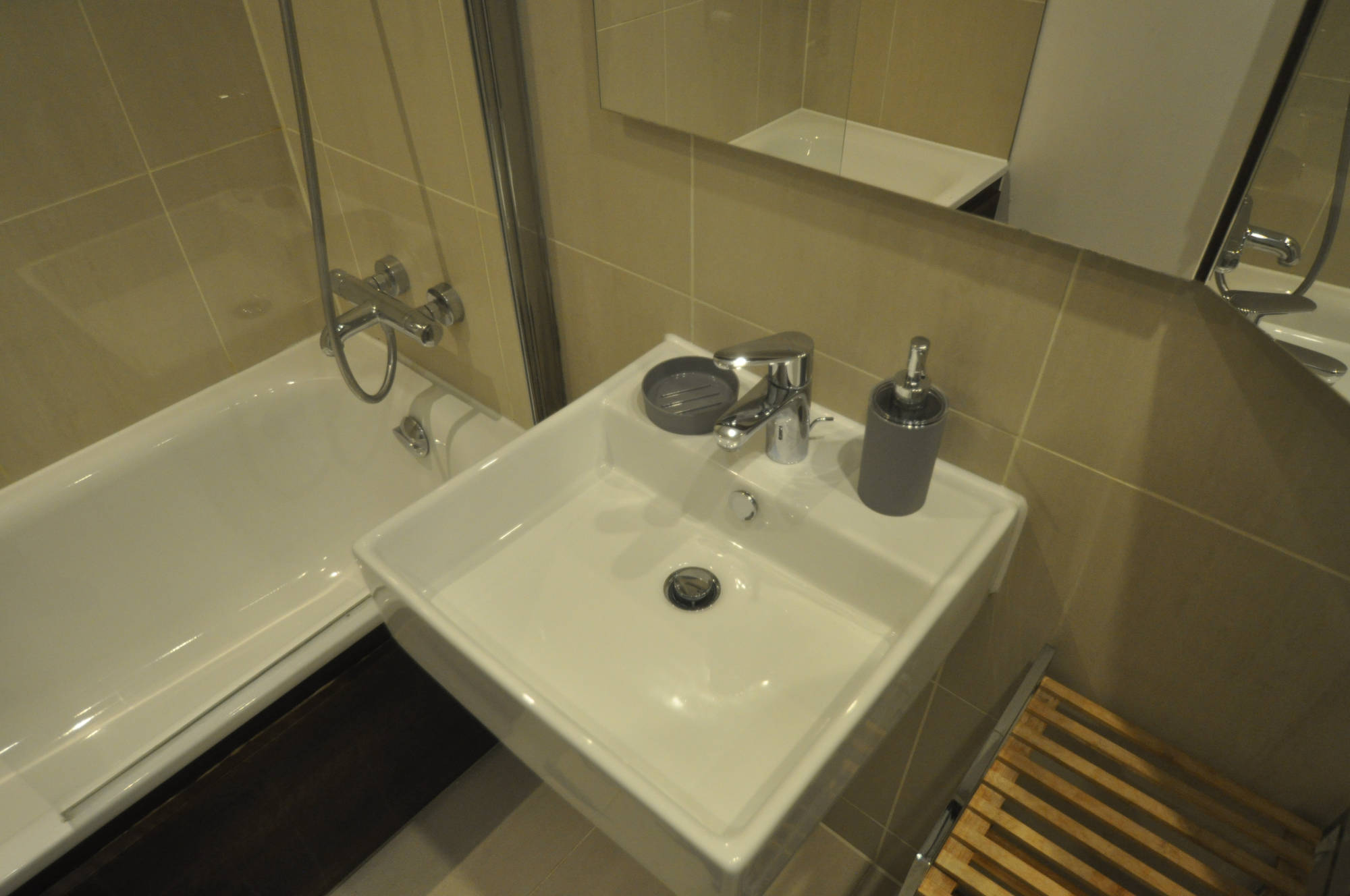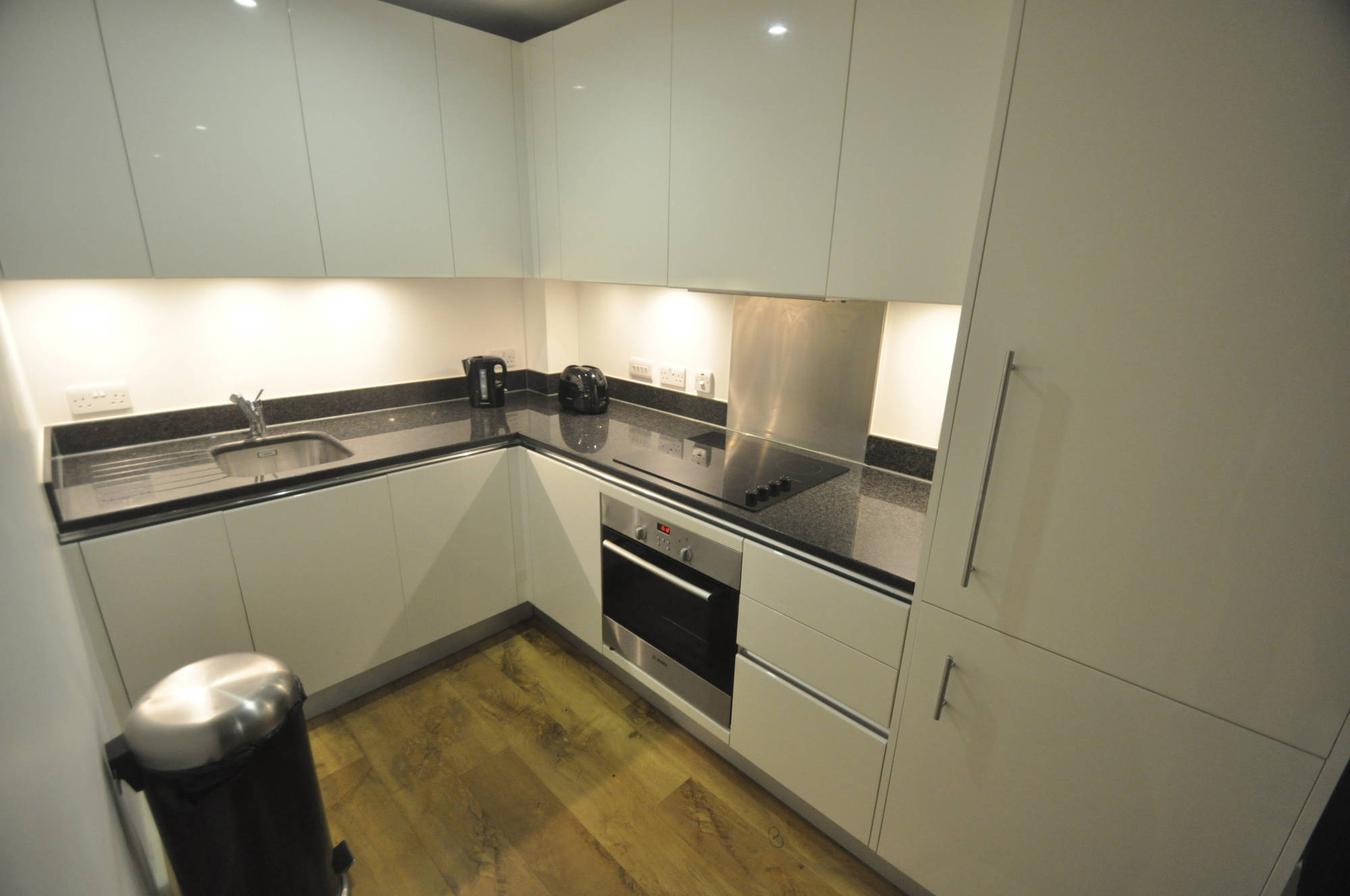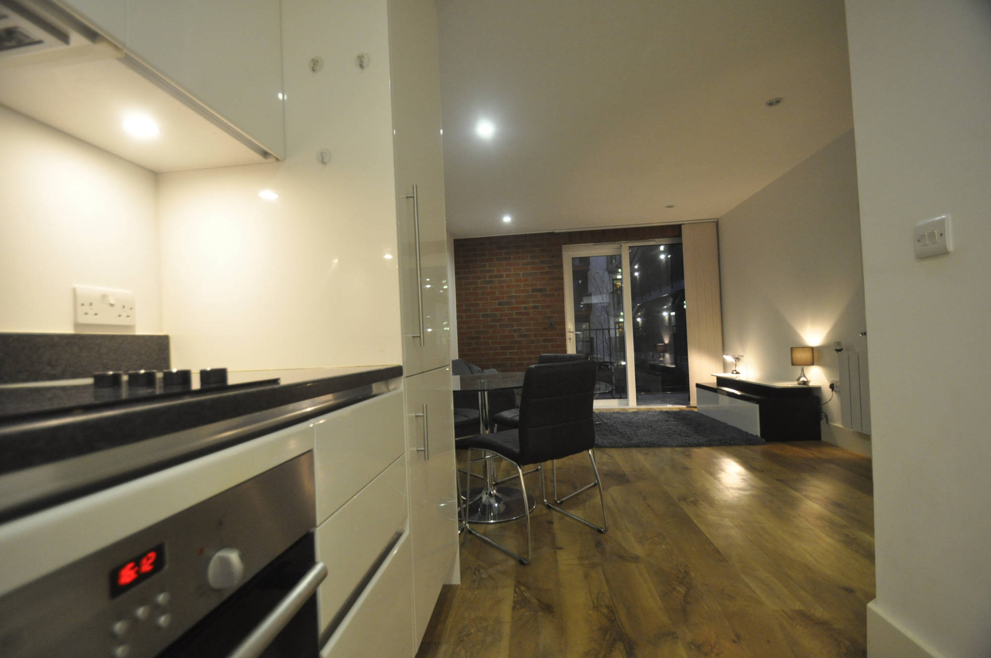 The flat is modern and located in a pedestrianised area. You have a kitchen/lounge with your own balcony overlooking a well kept yard with beds and benches. There is large bedroom with built-in wardrobe.